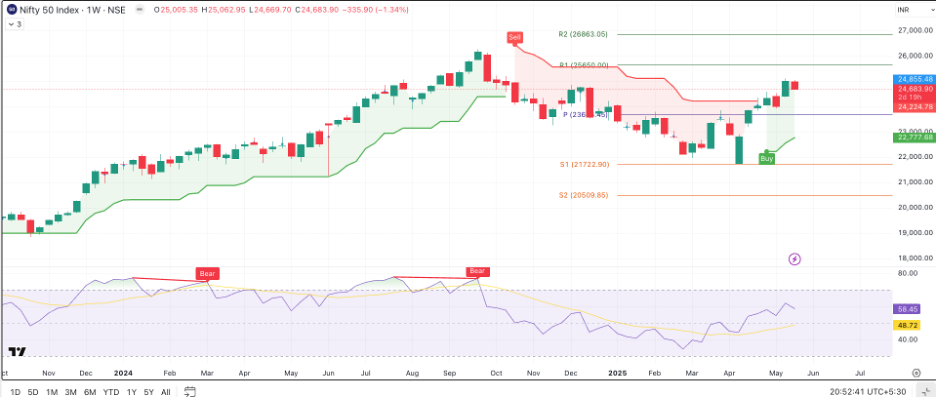 - Also, we got a second confirmation supporting our Golden Crossover, Super Trend Indicators indicating bullish on the Weekly chart, both on Nifty and Ban Nifty.
