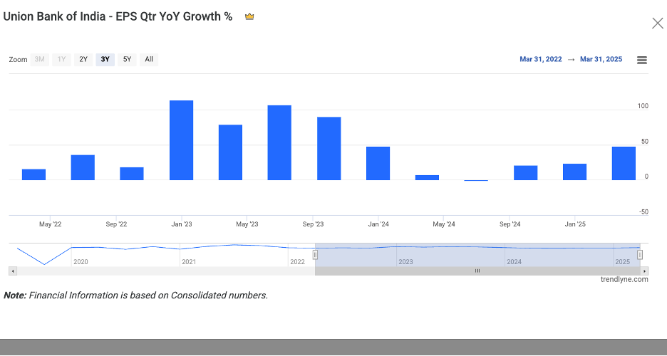 Union Bank’s book value is comparatively less than that of other banks. The PE ratio is lower than the industry average, and the PEG is much less than 1. Fine. The company is relatively undervalued. The next question about the business is that the EPS growth rate has been above 20% over the past three quarters, which indicates strong quarterly results, and the company has a history of giving even better results.