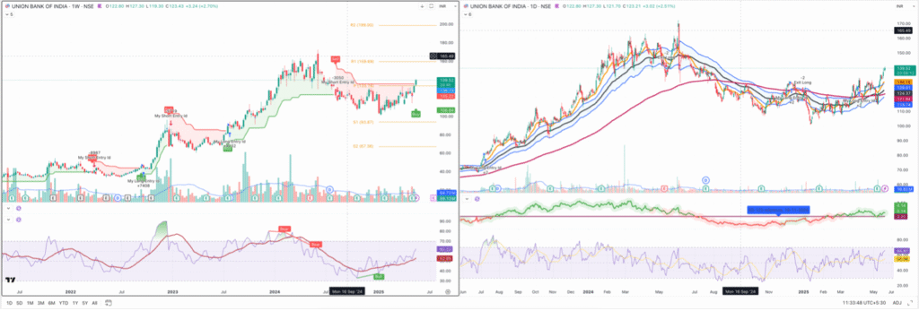 You can see the chart patterns; the left is a weekly chart, and the right is a daily chart. On the weekly chart, Super Trend indicates bullish activity with above-average volumes.